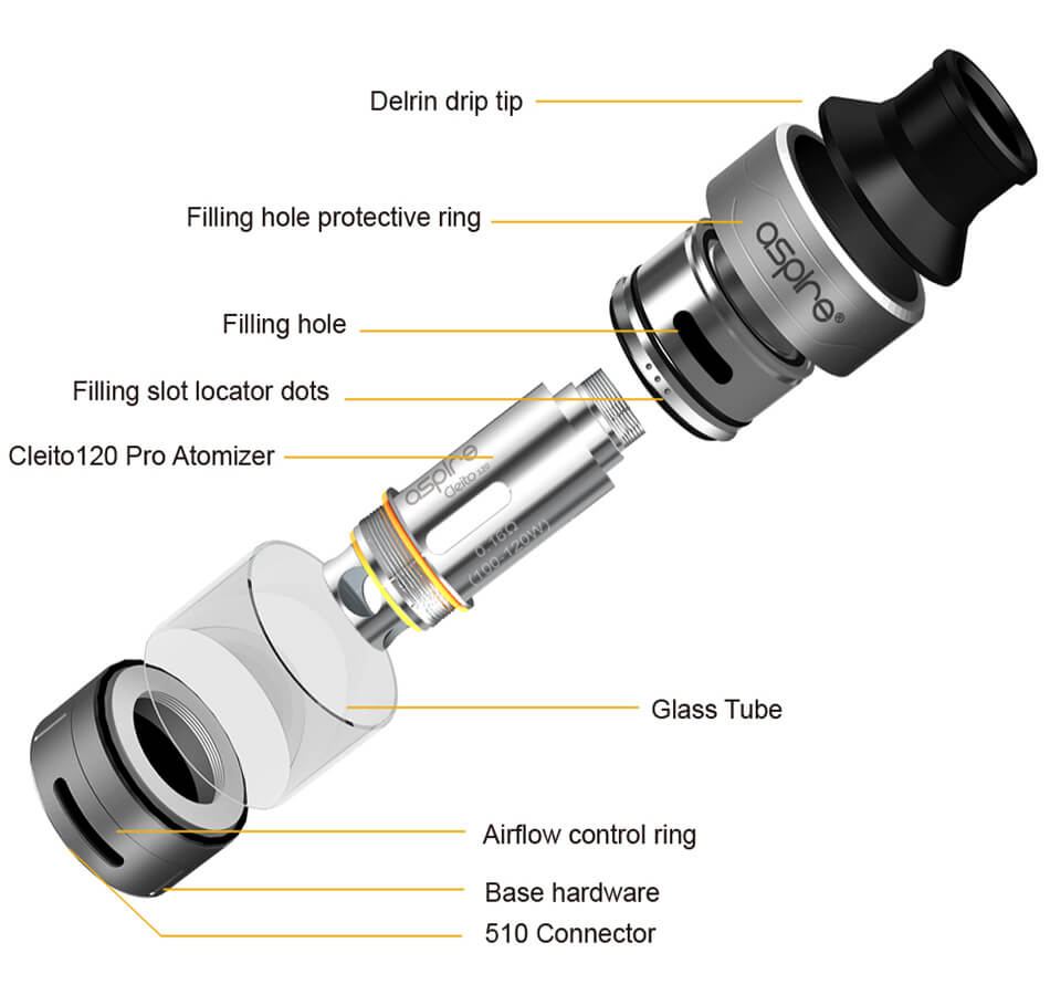 Aspires Cleito 120 Pro Tank wird mit dem standartmäßigen 510er Gewinde und einem extrabreiten Delrin Drip Dip geliefert.