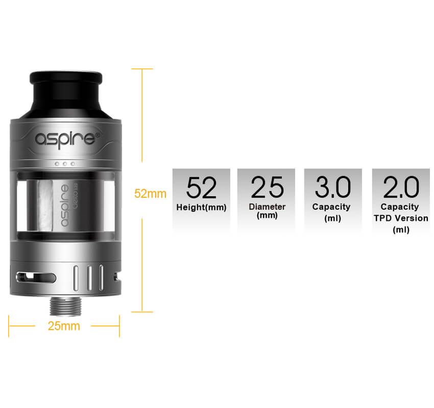 Die Höhe des Atomizers beträgt 52 mm bei einem Durchmesser 25mm. Natürlich kann er wie gewohnt auseinandergebaut werden, so dass die Reinigung erleichtert wird.
