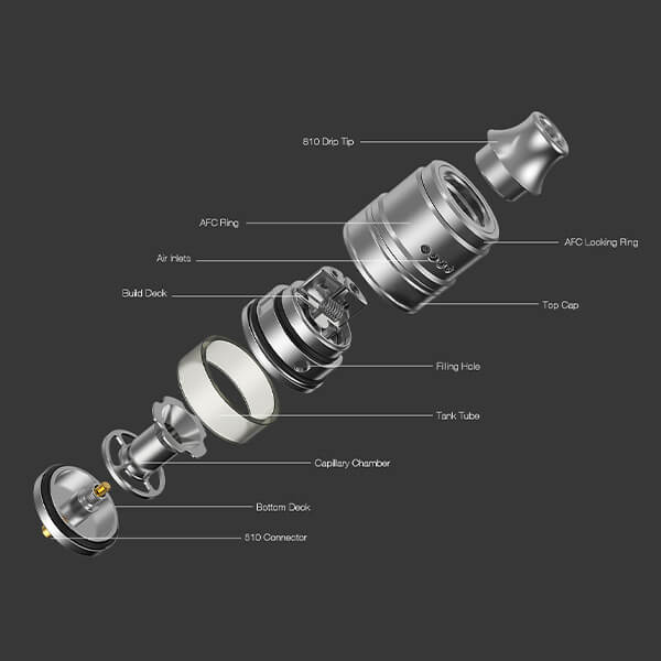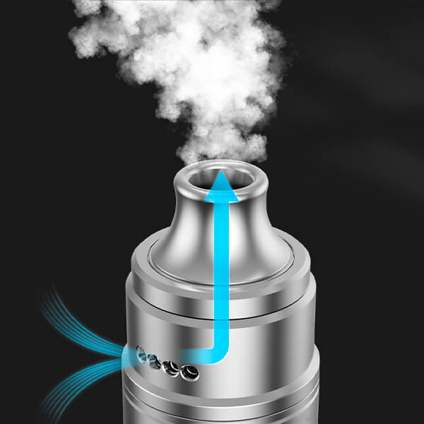 Die Airflow Control bringt vier Lufteinlässe mit, die nach Belieben geöffnet oder geschlossen werden können, um den Luftzug zu steuern. Der Kumo RDTA ist auf Grund seiner Bauweise sowohl für RDL (Restricted Direct Lung) als auch für MTL (Mouth To Lung) Züge geeignet. Das 810er Mundstück ist abnehmbar und somit auch austauschbar.