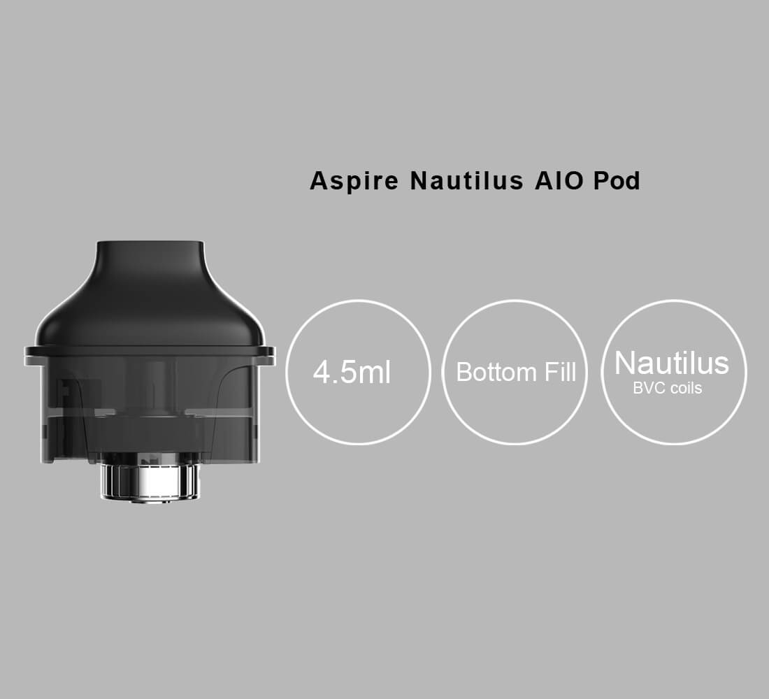 1 x Cartridge (Pod) mit 1.8 Ohm und 4.5ml Tankvolumen für das Aspire Nautilus AIO Kit.