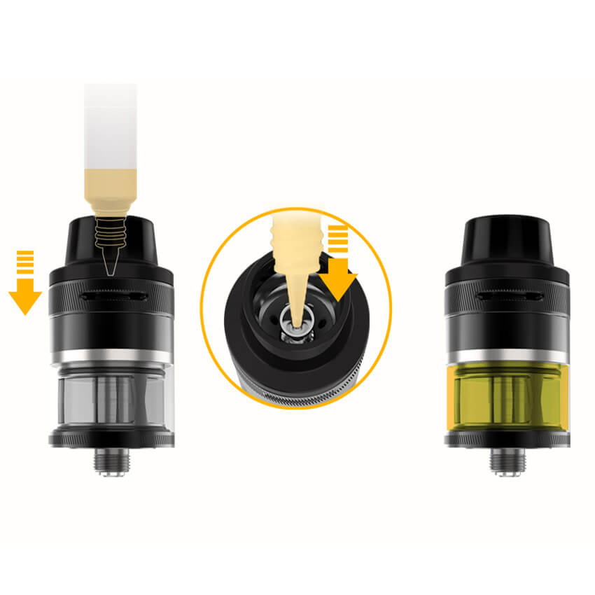 Ein besonderes Feature bringt das TopFilling mit sich. Hier geht das Befüllen deutlich schneller und reibungsloser vonstatten, da das Entfernen der Top Cap entfällt. Das Liquid wird direkt durch das Drip Dip in den Tank gegeben. Drückt man mit der Flasche auf das Füllroher, federt es sanft nach unten und öffnet den Zugang. Nach dem Volltanken federt es zurück und verschließt das Einfüllrohr.