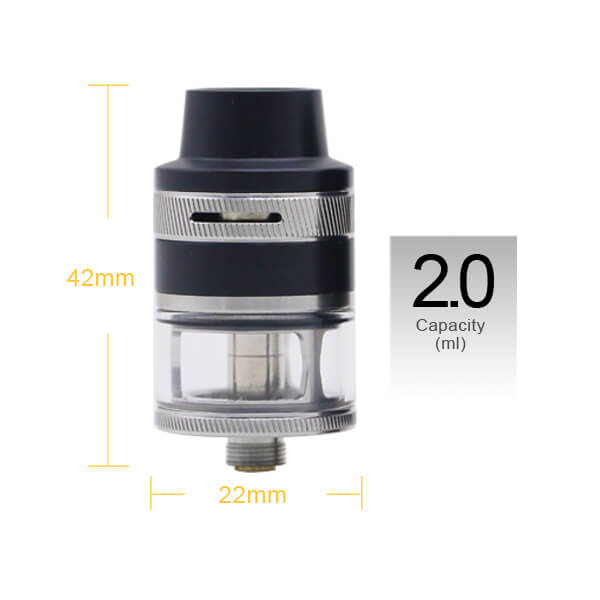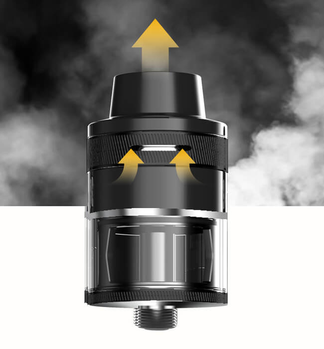 Die verstellbare Airflow sitzt oberhalb und bietet ein beeindruckendes Lufstrom-System. Drei Luftlöcher leiten die Luft um den Verdampfer-Kopf herum bis nach unten. Dabei entsteht ein Maximum an Geschmack und Dampf.