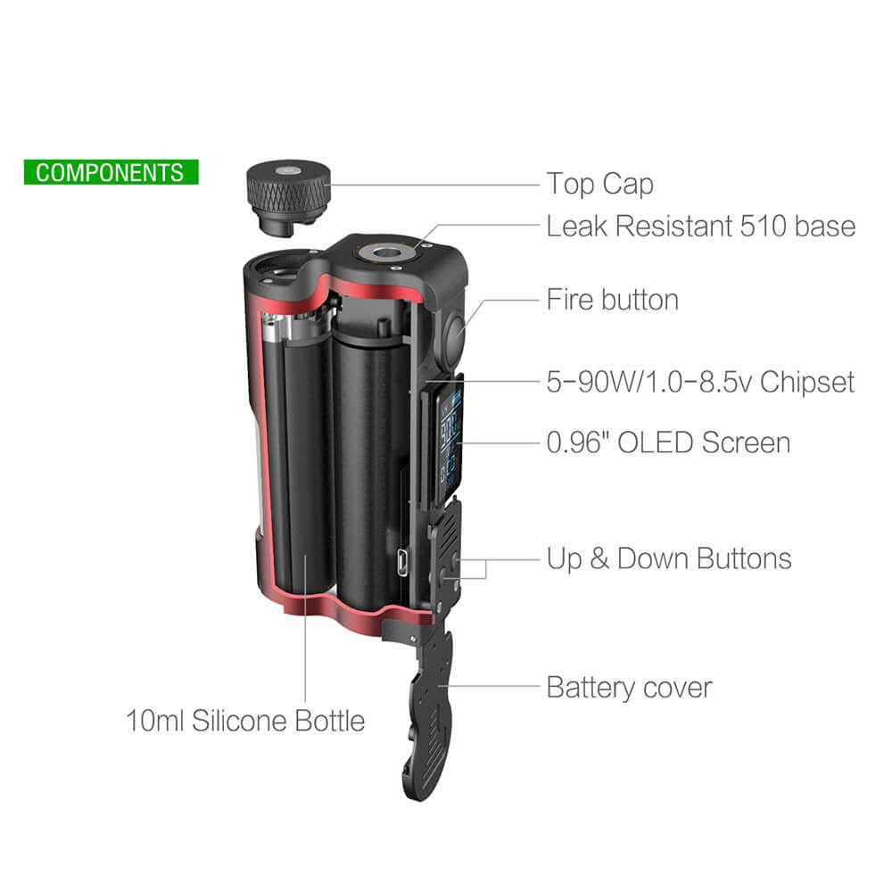 Er benötigt eine 21700er oder 18650er Batterie und bringt es auf eine maximale Ausgangsleitung bis zu 90 Watt und eine Ausgangsspannung von 1.0V-8.5V. Der Widerstandsbereich liegt bei 0.08 Ohm – 3.5 Ohm. Mit dem beiliegenden USB-Kabel wird der leere Akku schnell wieder einsatzbereit gemacht.