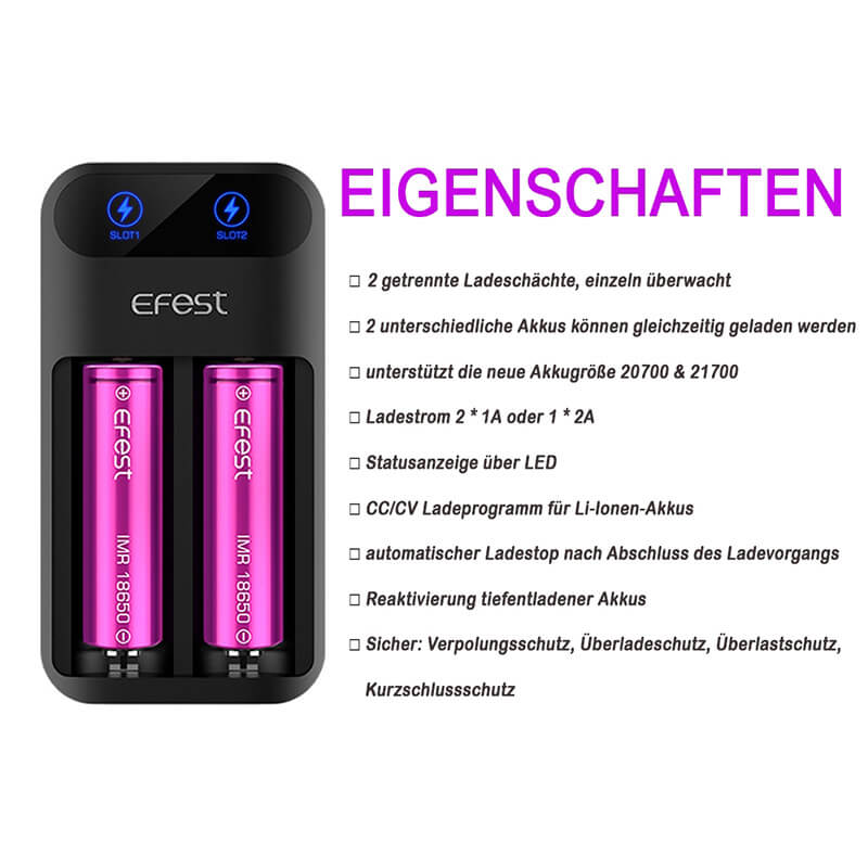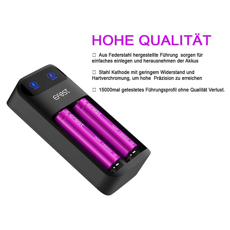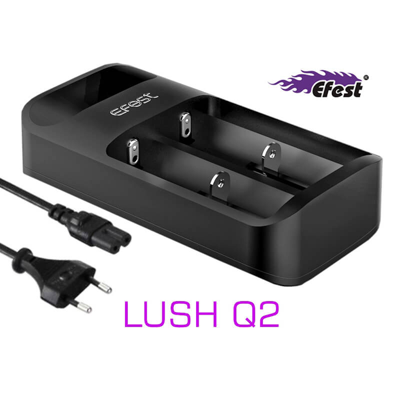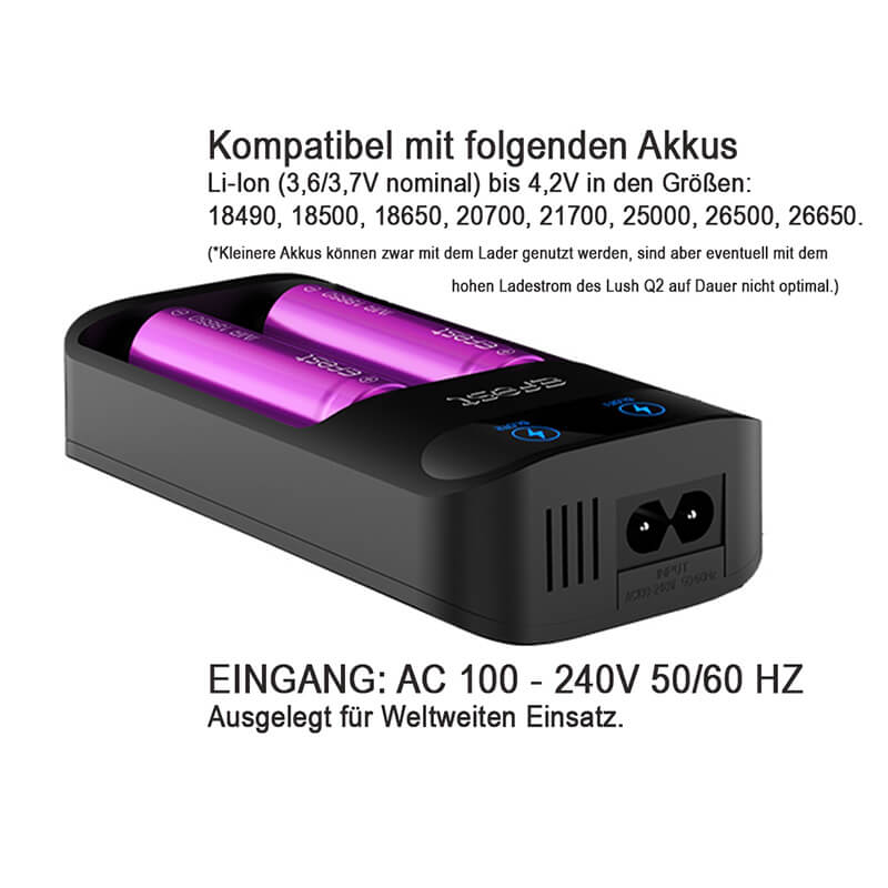 Das Lush Q2 von Efest ist ein 2-Schacht Li-Ion Ladegerät, welches eine einfache Bedienung, hohen Ladestrom und kraftvolle Stromversorgung bietet. Im Set enthalten ist ein reisetaugliches 100-240V Netzkabel mit EU Stecker. Das Lush Q2 kann 2 Akkus gleichzeitig mit 1 Ampere auflanden und einen einzelnen Akku mit 2 Ampere. Das Ladegerät ist für alle Lithium-Ionen Akkus (IMR, INR, ICR) mit Nominalspannung 3.6 / 3.7V geeignet und läd diese bis 4.20 Volt auf.