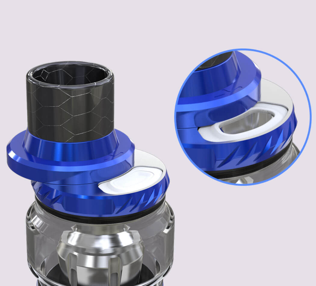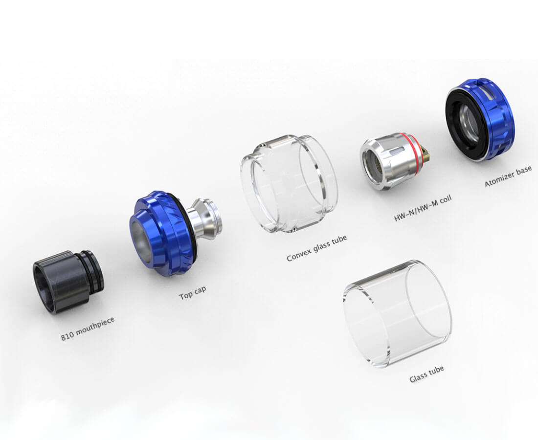 Der 56mm hohe Verdampfer verfügt über einen Durchmesser von 28mm, so dass ein 6.5ml Tank gut Platz hat. Zwei unterschiedliche Tubes können verwendet werden. Ein leichtes Nachfüllen von Liquid erfolgt über die aufschiebbare Topcap.