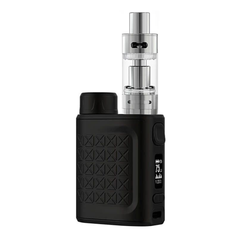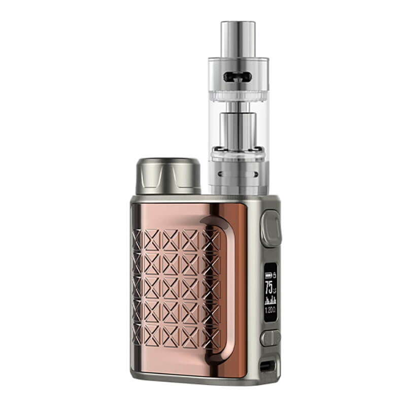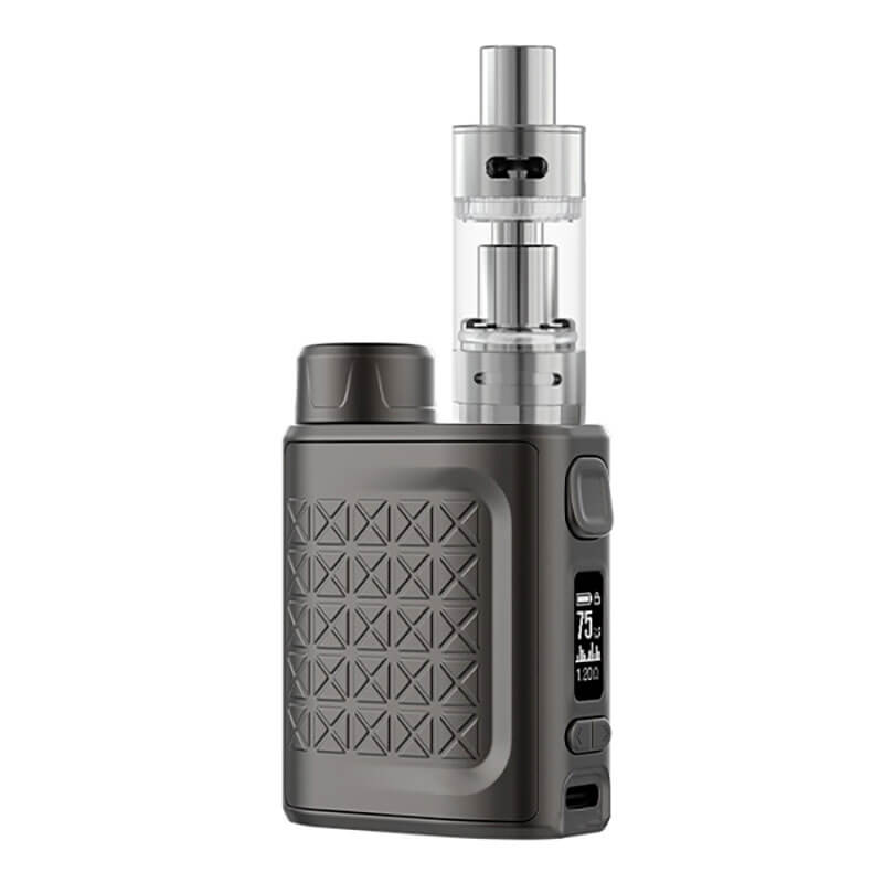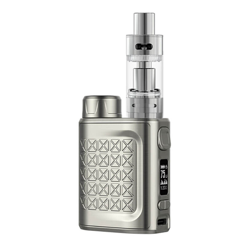 Die gemusterte Oberfläche ist in vier Farbvarianten erhältlich und ein visueller Blickfang. Neben diesen Aspekt sorgt die Beschaffenheit auch für einen guten Grip. Das Kit ist 135mm lang, 50mm breit und 27.5mm tief. Der Akkuträger bietet Platz für eine separat erhältliche 18650er Akkuzelle, die über das 2A USB-C Ladekabel schnell wieder geladen werden kann. Mit dem verbauten Chipsatz ist eine Ausgangsleistung bis maximal 75 Watt (9.0V) möglich. Es kann im VW (Power) oder TC Mode gearbeitet werden. Auf dem brillanten 0.49 Zoll OLED-Display sind alle Werte anstandslos ablesbar.