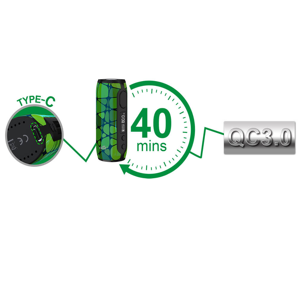 Dem Mod wurde ein integrierter Akku verbaut, der über eine Kapazität von 3000mAh verfügt. Diese sollte für eine ganze Weile ausreichen, kann aber nach Verbrauch in nur 40 Minuten Ladezeit, mit dem 3.0A QC, via USB aufgeladen werden. Dank des verbauten Chipsatzes kann eine maximale Ausgangsleistung bis zu 80W erreicht werden. Dabei erstreckt sich der Widerstandbereich von 0.05 Ohm-3.0 Ohm. Desweiteren beinhaltet der Chip zur Sicherheit verschiedene Schutzfunktionen. Auf dem kleinen OLED-Display können alle Vape-Informationen klar abgelesen werden. Das Handling und die Menüführung wurden besonders benutzerfreundlich entwickelt. Der große Feuertaster ist bequem erreichbar. Der untere Teil der Taste ist gesperrt, so dass nur der obere Bereich gedrückt werden muss.