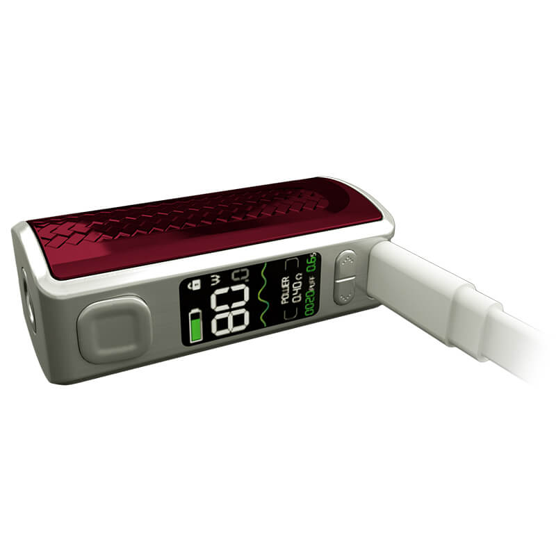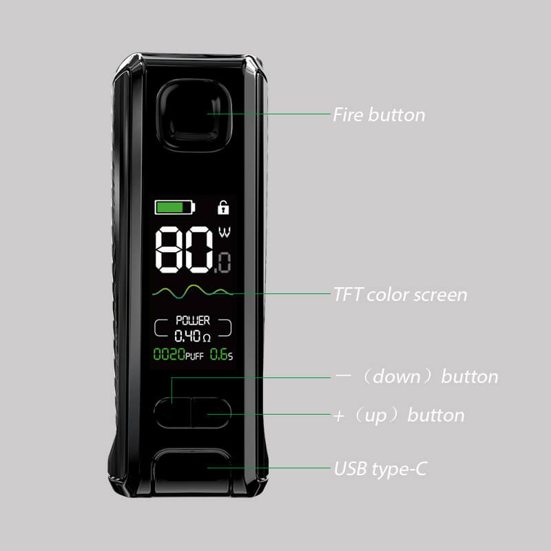 Der Akkuträger verfügt über eine verbaute 1800mAh Akkuzelle, mit der zwischen 1W-80W gedampft werden kann. Dabei reicht der Widerstand von 0.1 Ohm-3.0 Ohm. An der schmalen vorderen Längsseite findet man alle Knöpfe und Bedienelemente (Feuerknopf / Up & Down-Schalter / 0.96 Zoll Display / USB-Ladeanschluss) vor, die man braucht um das Gerät mühelos zu bedienen.