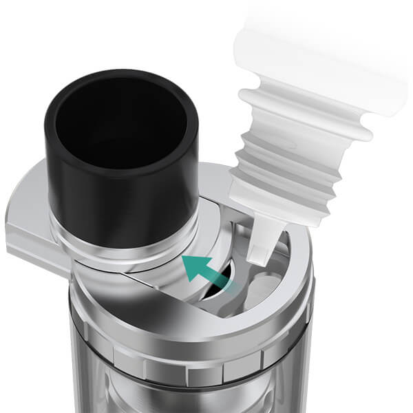 Der Eleaf Melo RT 25 besitzt ein neuartiges Topfilling-System, das sogenannte Retractable Top Fill System. Bei diesem System wird zum Befüllen einfach nur die Topcap beiseite geschoben, was auch ein leichtes Nachfüllen unterwegs ermöglicht.