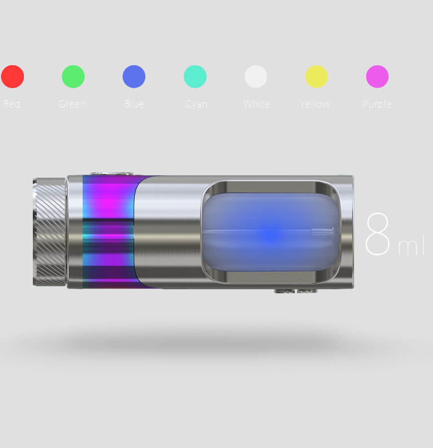 Die große, lebensmittelechte Silikon – Squonker – Flasche verfügt über ausreichend Volumen, um sie mit 8ml Liquid zu bestücken. Dank dieser Füllmenge verlängern sich die Nachfüllungs – Zyklen erheblich. Die Bottle lässt sich spielend einfach zusammen drücken, so dass das BF ein Leichtnis ist. Außerdem wird sie von einem LED – Licht beleuchtet (7 verschiedene Farben sind möglich), was für einen netten, dekorativen Blickfang sorgt.