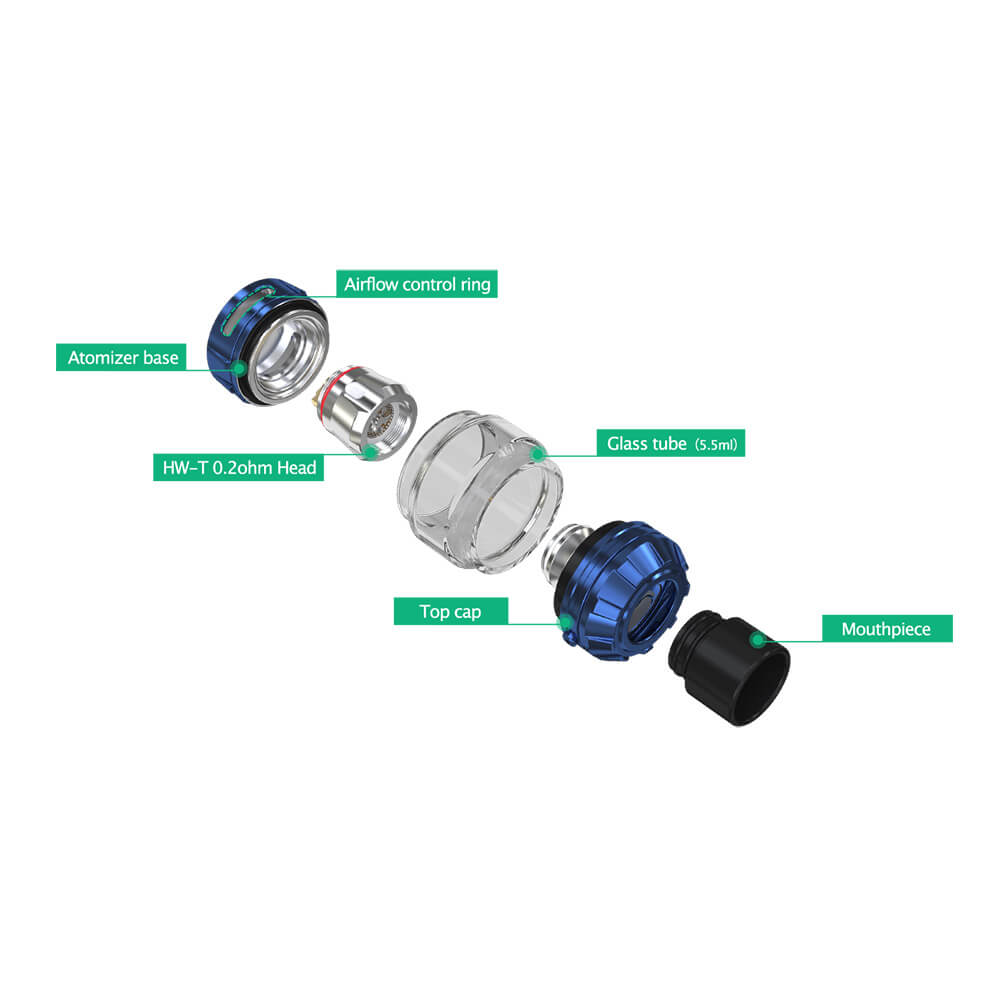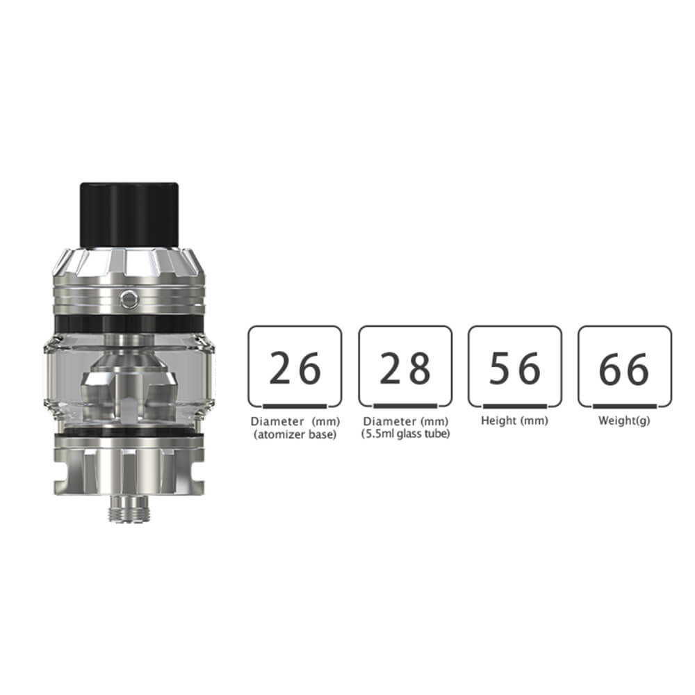 Der aus Edelstahl und Pyrexglas sorgsam verarbeitete Tank besitzt die Maße 56mm x 28mm und ein Gewicht von 66g. Das Volumen beträgt satte 5.5ml und wird über das Topfill-System befüllt. Dank der Kindersicherung (push-to-open) wird ein versehentliches Öffnen verhindert. Auch das Auslaufen des Liquids kann beinahe ausgeschlossen werden.