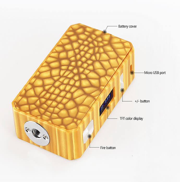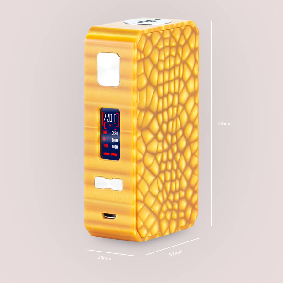 Mit 2x 18650er Batterien wird der Akkuträger gestartet und kann so 220 Watt erreichen bei einer Ausgangsspannung von 0.5V - 8V. Mit einem maximalen Ladestrom von 2A kann der Akku schneller und effizienter vollständig aufgeladen werden. Zusätzlich nutzt der Mod ein Balancelade-System, um zwei Batterien auf die gleiche Ladekapazität zu bringen, was den Akku schont. Aufgeladen wird über den USB-Anschluss mit einem Wandadapter oder Computer oder mit einem externen Ladegerät. Auch die neuesten Updates werden so aufgespielt.