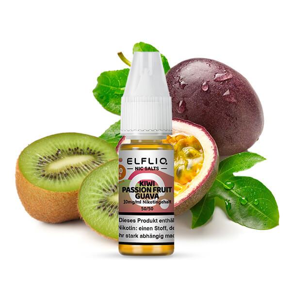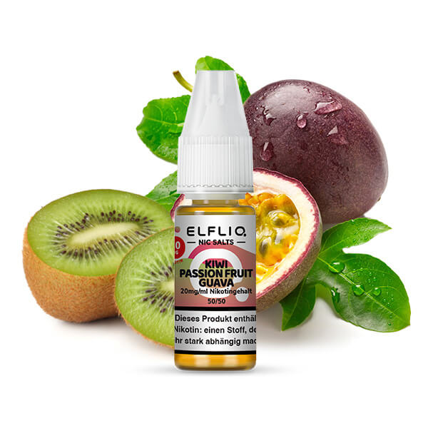Das Nikotinsalz ELFLIQ Kiwi Passion Fruit Guava von Elf Bar wird in einer 10ml Flasche mit Sicherheitsverschluss geliefert! Der Nikotingehalt liegt wahlweise bei 10mg/ml oder 20mg/ml.