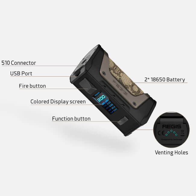 Zur Inbetriebnahme müssen zwei separat erhältliche 18650er Akkus in den Aegis eingesetzt werden, so dass der leistungsstarke Chip bis zu 200 Watt liefern kann. Über dem USB Port werden die Zellen wieder geladen und aktuelle Firmware aufgespielt.
