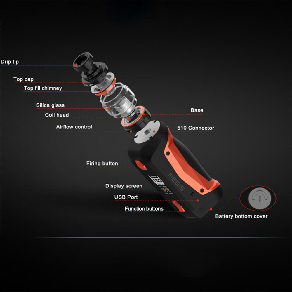 Mit dem Aegis Solo Kit (128.9mm x 41.2mm x 31.5mm) von GeekVape erhält man ein E-Zigarettenset für den täglichen Bedarf, welches widerstandsfähig, strapazierfähig und robust ist.