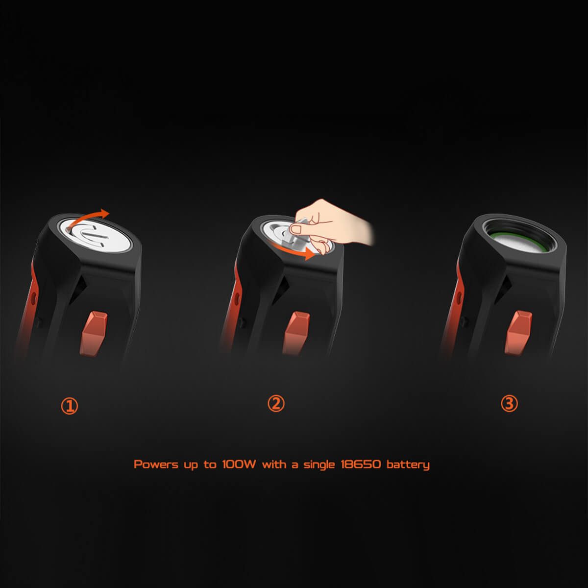Staub macht dem Mod nichts aus, Wasser auch nicht, ebenso ein gewisses Maß an Stößen kann er ab. Nach der IP 67 Norm weist er die genannten Resistenten auf, so dass man den Akkuträger ordentlich belasten und überallhin mitnehmen kann, da er nicht so einfach verschmutzt, zerkratzt oder zerbricht. Zudem hält er einer gewissen Kälte und Hitze stand. Eine separat erhältliche 18650er Akkuzelle wird für den Betrieb benötigt, die zügig über einen USB-Anschluss geladen werden kann. Eine maximale Ausgangsleistung von 100 Watt kann erreicht werden. Auf dem OLED-Display sind alle Vape-Informationen hinterlegt. Die Bedienung ist selbsterklärend.