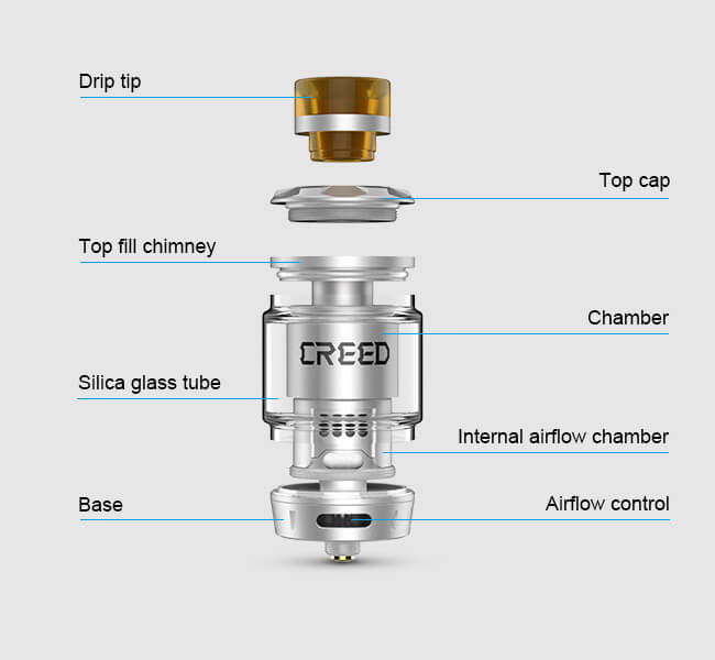 Eine Langlebigkeit des Creed RTAs wird dadurch begünstigt, dass sich der Verdampfer für eine perfekte und hygienische Reinigung vollständig auseinanderbauen lässt.