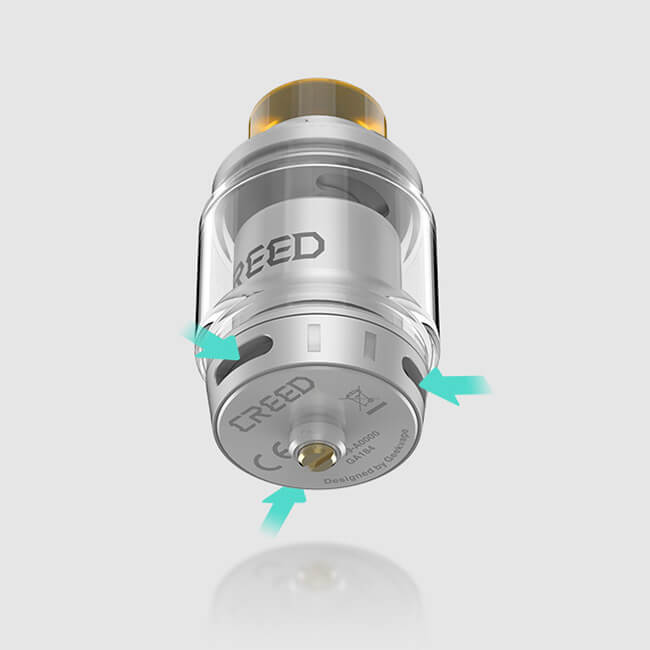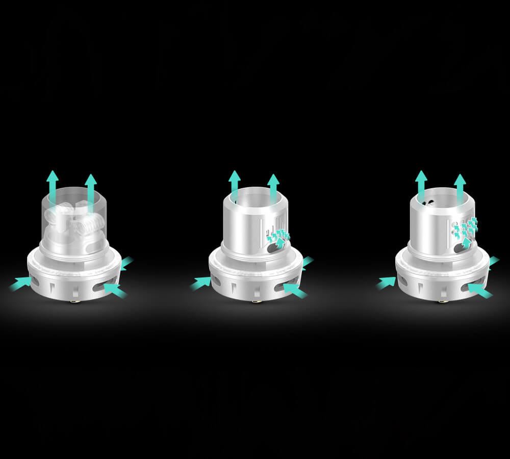 Das Hauptaugenmerk liegt beim Creed ganz klar auf der innovativen und vielseitigen Airflow Control. Man hat hier die Möglichkeit die Airflow zu verändern, bzw auszutauschen. 3 unterschiedliche Varianten (normal große Löcher / große Air-Schlitze / ohne Luftlöcher) liegen der Lieferung bei und ermöglichen so ein facettenreiches Dampferlebnis. Dies ermöglicht eine optimale und stufenlose Regulierung des Luftstroms nach den eigenen Bedürfnissen.