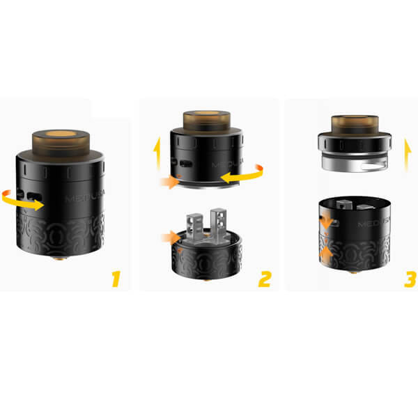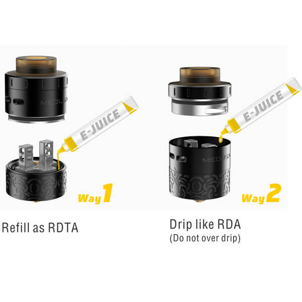 Der Medusa RDTA von GeekVape ist ein Hybridverdampfer, welcher als Tank- und auch als Tröpflerverdampfer betrieben werden kann. Bei der Verwendung als Tankverdampfer fasst der Tankinhalt bis zu 3 ml Liquid.
