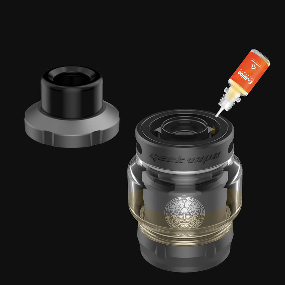 Der Z Max Tank von GeekVape ist ein dicker Subohm Verdampfer, mit einem satten 4ml Tankvolumen. Wem weniger reicht, der nutzt das mitgelieferte 2ml Ersatzglas. Das altbewerte und auslaufsichere Topfill-System kommt auch hier zum Einsatz und erleichtert das Auffüllen. Nach dem die Top Cap abgenommen wurde erscheint das Einfüllloch.