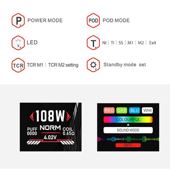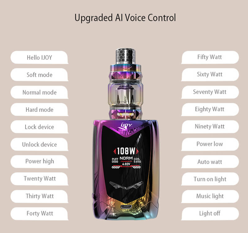 Der Avenger Akkuträger überzeugt mit mehreren Highlights. Eines davon ist sicherlich das innovative Sprachsteuerungssystem. Mit der Stimme werden sämtliche Faktoren, wie zum Beispiel das Entsperren des Bildschirms, die gewünschte Wattzahl (max. 108W), die Modis oder die Lieblingsfarbe, personalisiert und geregelt. Ersichtlich werden die getätigten Einstellungen auf dem großen 1.3 Zoll OLED-Farbdisplay. Im Lieferumfang inbegriffen sind zwei neue 20350er Akkus, die eine angemessene Laufzeit bieten. Durch Quick-Charging wird die verbrauchte Kapazität via USB geladen. Über selbigen Anschluss kann die Firmware ebenfalls aktualisiert werden. Der große Feuertaster wurde optimal positioniert und lässt sich bequem betätigen.