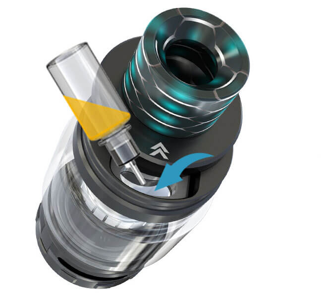 Zur Auswahl steht die Nutzung eines normalen 6ml Gals-Tubes oder das 8ml Bulb-Glas. Beide Behälter werden von oben mittels des Slide Fillings (zur Seite Schiebens der Cap) sauber und schnell befüllt. Auch eine Airflow Control ist standardmäßig eingebaut und ist stufenlos einstellbar.