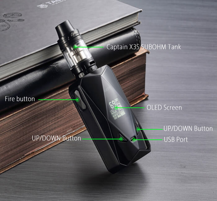 Perfekt auf den Mod abgestimmt ist der aktuelle Captain X3S Verdampfer, der aus der bereits erfolgreichen Captain Familie stammt und locker mit seinen Vorgängern mithalten kann. Sein Tankvolumen von 4.2ml wird von oben mit Liquid befüllt. Dazu muss die Cap zur Seite geslidet werden, damit das Einfüllloch zur Befüllung bereit steht. Für eine ausgewogene Dampf – und Geschmacksentfaltung stehen dem X3S die X3-Coils (0.15Ohm – 0.4Ohm) zur Verfügung. Durch die Bottom Airflow, die stufenlos eingestellt werden kann, werden die Verdampferköpfe bestens mit Frischluft versorgt und die Temperatur angenehm kühl gehalten.