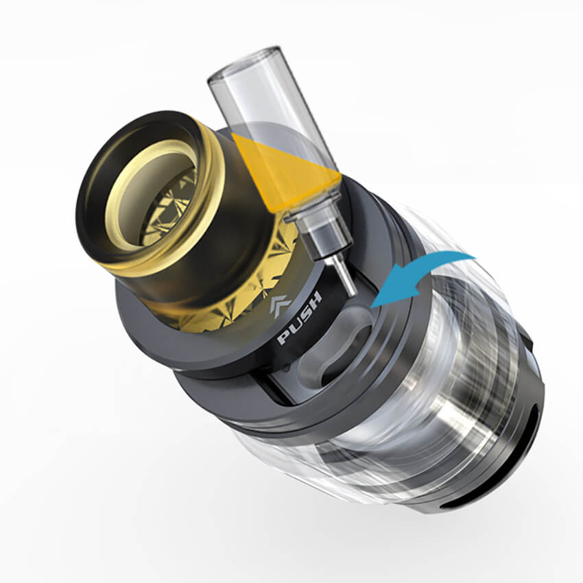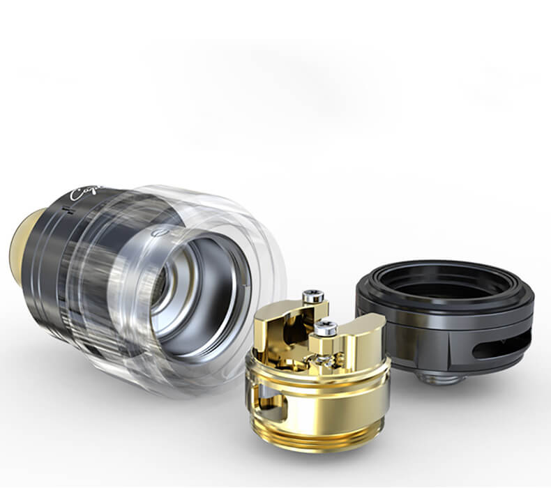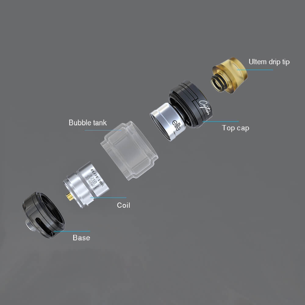 Das Highlight besteht hier in den 3 verschiedenen Vape- Typen (Subohm / RTA / POD). Der Captain Elite RTA Verdampfer vervollständigt dieses Set. Der Selbstwickler verfügt über ein großzügiges Single – Coil Deck, worauf selbst üppigere Wicklungen genügend Platz finden und leicht montiert werden können. Wer nicht so gerne bastelt oder einfach eine Abwechslung wünscht, der kann die bereits fertigen Elite Coils (0.25Ohm / 30W-60W) ebenfalls benutzen. Die Belüftung der Wicklung / Fertig-Coils kommt durch die großen, seitlichen Luftlöcher und kann nach Bedarf ausgerichtet werden. Das Tankvolumen beträgt 2ml kann aber auf 3ml aufgestockt werden, nutzt man dazu das passende Bubble Glass-Tube. Aufgefüllt wird von oben über das TopFillng, bei dem die Sillikoneinfülldichtung zusätzlich austauschbar ist. Innovativ und außergewöhnlich ist die Möglichkeit, dass das Elite Mini Kit als Pod – System nutzbar ist. Hierfür befindet sich im Lieferumfang ein J&P Pod Adapter, mit dem man die Cartridge auf dem Akkuträger verwenden kann.