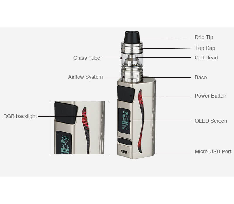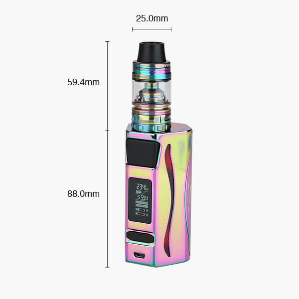 Zum Betreiben des Mods, mitsamt seines brandneuem IWEPAL Chipsatz werden zwei 20700er Batterien verwendet. Diese sind im Lieferumfang inklusive und bieten eine gleichbleibend gute Versorgung. Auch das Nutzen zweier 18650er Zellen ist mit einem Adapter möglich. Die Akkus sind im Handumdrehen eingesetzt und das Fach wird durch einen magnetischen Verschluss geschlossen. Geladen werden sie über den USB Port, über dem auch die aktuellste Firmware aufgespielt werden kann. Enorme 234 Watt Höchstleistung kann erzielt werden. Ein Highlight stellt die LED Beleuchtung dar. Diese kann in 5 verschiedenen Farben eingestellt werden und auch eine Taschenlampenfunktion wurde hinzugefügt.