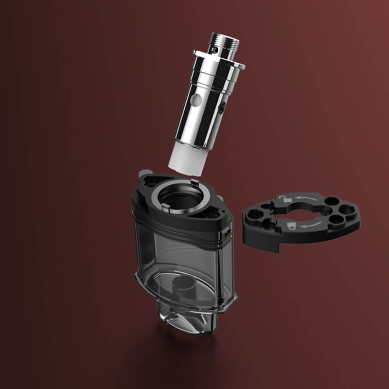 Die dazugehörige Cartridge bringt ein 4ml Tankvolumen mit, welches von der Seite mit Liquid betankt wird. Bringt man den Pod durch eine 180 Grad Drehung in eine andere Postition, wird dadurch die Airflow Einstellung geändert.