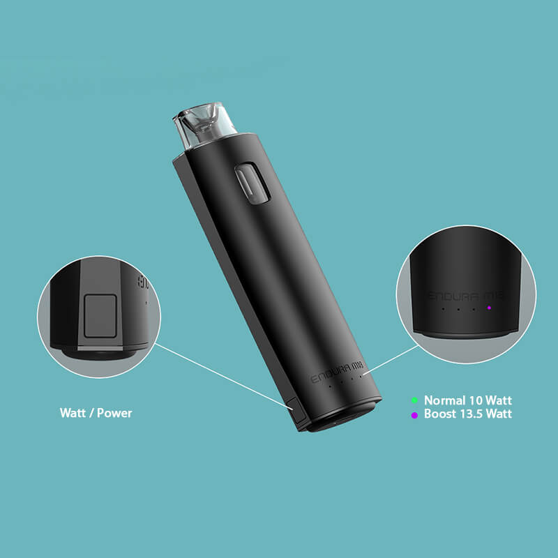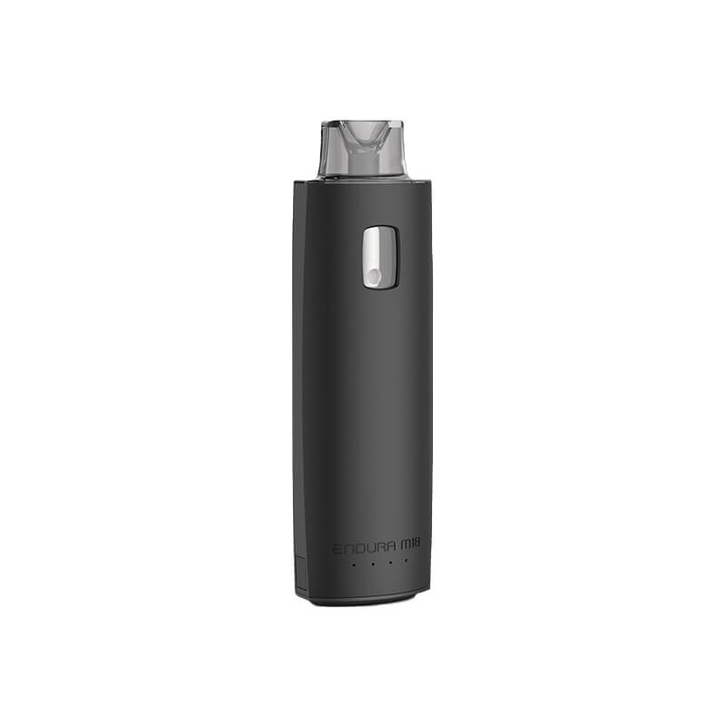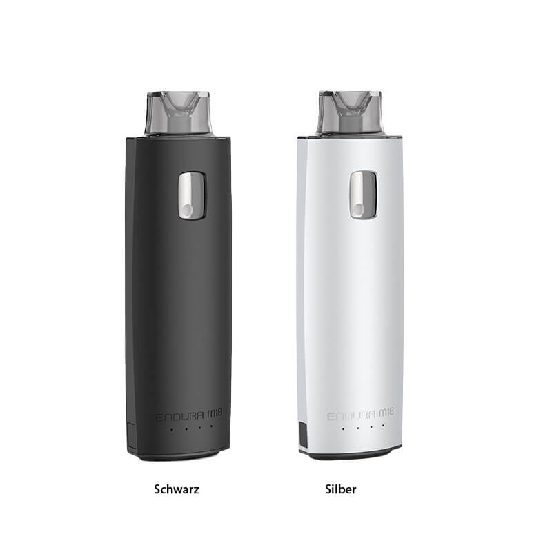 Das elegante und stilsichere Endura M18 Kit von Innokin ist ein kompaktes und transportfähiges Set, mit den Maßen 86.5mm x 30.2mm x 17mm. Es ist robust und in den Farben Schwarz und Silber erhältlich.