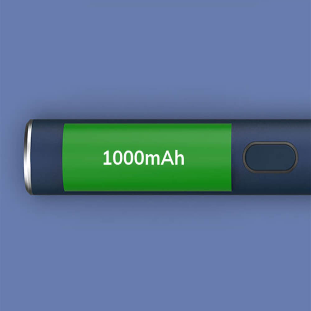 Ein verbauter 1000mAh Akku treibt das Kit an und kann bei Bedarf über den USB-C Ladeanschluss mit 0.5A rasch wieder geladen werden. Am Feuerknopf befindet sich ein LED Licht, welches in drei Farben (Grün: 100%-60% / Gelb: 60%-20% / Rot: 20%-0%) den Ladestand kenntlich macht. Die konstante Leistungsausgabe beträgt ca 13.5 Watt.