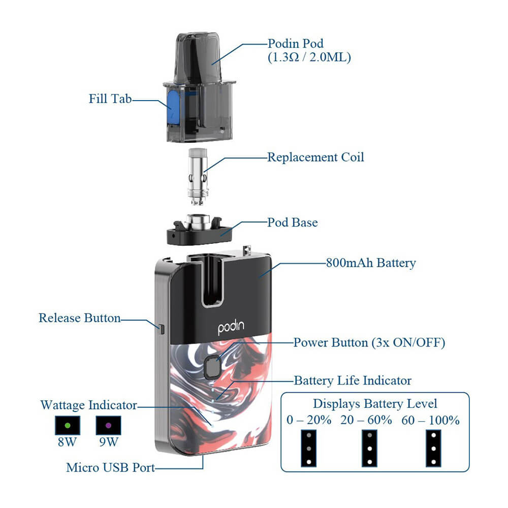 Das intuitive Podin Pod Kit von Innokin wird spielend einfach bedient und ist ein sehr leichtes, ergonomisches Gerät (61mm x 46mm x 16mm). Das marmorierte Design ist ein richtiger Blickfang und in unterschiedlichen Farben erhältlich.