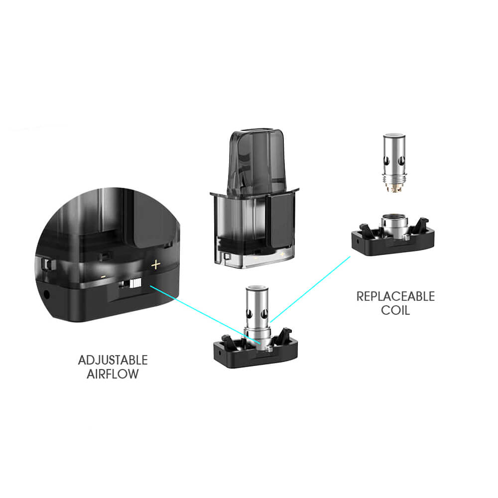 Auch die Verdampferköpfe sind ganz easy austauschbar. Die Coils haben einen Widerstand von 1.3 Ohm (8W-9W) und liefern ein aromatisches Backendampfvergnügen (MTL). Zusätzlich gibt es unten an der Base des Pods die Funktion, den Luftstrom nach seinen eigenen Vorlieben ausrichten zu können.