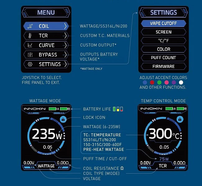 Beim Proton Mod fällt zunächst das große 1.45 Zoll Display ins Auge. Es fügt sich perfekt der schlichten, doch edlen Optik an und lässt alle zu entnehmenden Werte klar und übersichtlich erscheinen. Durch das Menü gelangt man spielend einfach. Gesteuert wird es mit einem innovativen Joystick, der sich unterhalb des Screens befindet. Die Ausgangsleistung beträt maximal 235 Watt. Dazu sind 2x 18650er Akkus nötigt, die separat erworben werden müssen. Über den 2A Micro – USB –Anschluss werden sie geladen, ebenfalls können über diesen Port die neuen Updates aufgespielt werden. Sämtliche Bedien - Elemente sind komfortabel erreichbar, zudem gibt es nette Gimmicks wie das Vorheizen, Multi – Schutz oder die Akkustandsanzeige.