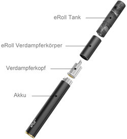 Die eRoll Batterie hat eine Kapazität von 90mAh und eine Spannung von 3,7V. Die hohe Spannung sorgt für eine sehr gute Dampfentwicklung und die Kapazität der eRoll Batterie reicht für ca. 3 Tankfüllungen.