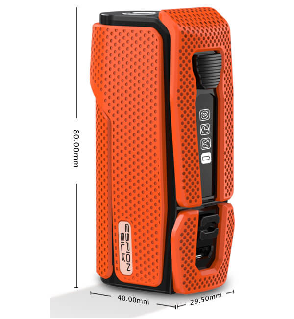 Der ESPION Silk Mod richtet sein Augenmerkt auf den besonders angenehmen Tragekomfort. Joyetech konstruierte dessen Außenhaut aus einem besonders weichen und geschmeidigen Material, was aufgrund seiner hypoallergenen Eigenschaften besonders für Leute mit empfindlicher Haut geeignet ist. Außerdem gibt die gummihafte Beschichtung eine extrem gute Griffigkeit, so dass einem der Mod nicht so einfach aus der Hand rutschen kann. Dank der Maße von 29.5mm x 40.0mm x 80.0mm ist der ESPION Silk schnell verstaut, was ihn zu einem idealen Begleiter macht.