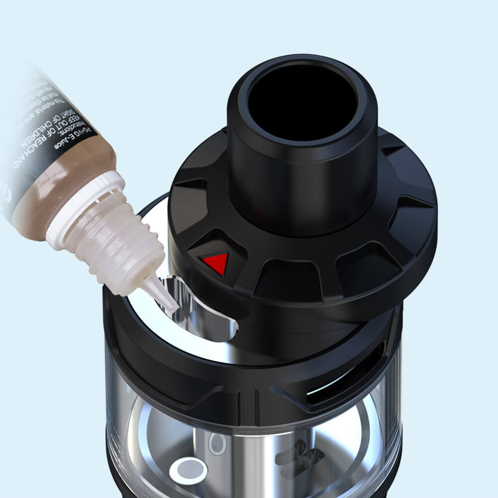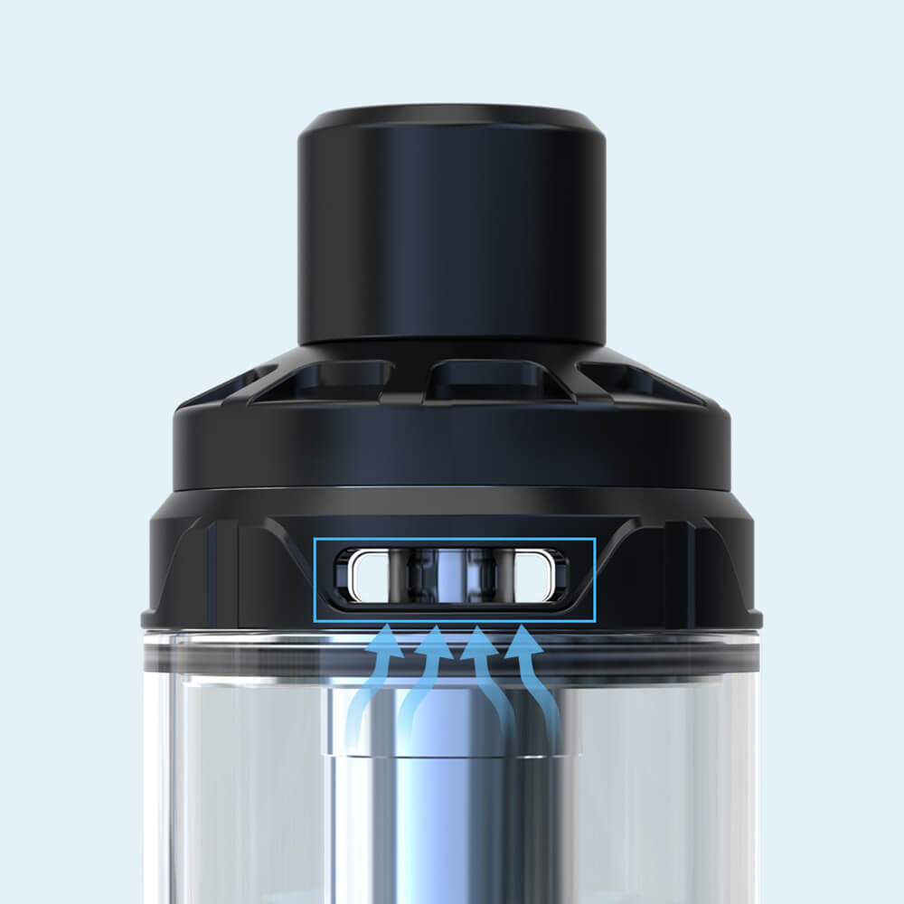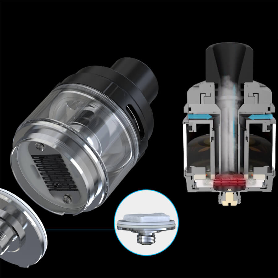 Gelungen kombiniert wird der Tour Mod mit dem grandiosen CUBIS Max Tank, der die Dampfer-Welt revolutioniert. Bei diesem Verdampfer wird auf Coils im herkömmlichen Sinn verzichtet und stattdessen auf das neuartige NCFilm-Heizelement (Kanthal 0.25Ohm) gesetzt. Dieses Heizgitter kommt horizontal in den Verdampfer und lässt, Dank der vergrößerten Oberfläche, die Heizwendel sich schneller und gleichmäßiger erhitzen, so dass auch das Liquid besser verdampft. Auch das Austauschen der Watte ist im Handumdrehen erledigt und wird nur simpel unter das Heizelement gelegt. Zusätzlich wurde der CUBIS Max mit einem satten 5ml Tankvolumen ausstaffiert. Mit Push-to-Open öffnet sich die Top Cap, so dass bequem durch das Topfill-System nachgeschenkt werden kann. Die Bottom Airflow kann nach den eigenen Bedürfnissen stufenlos reguliert werden und lässt die Luft ordentlich zirkulieren.