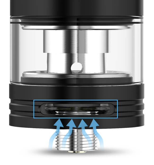 Am Boden der Base wurde die regulierbare Airflow positioniert, deren große Luftschlitze für einen perfekten Luftzug sorgen, so dass die Coils optimal belüftet werden und auch der entstehende Dampf wohl temperiert bleibt.