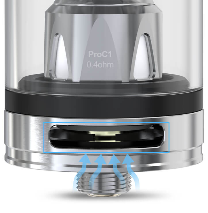 Der neue von Joyetech produzierte Verdampfer ist der ProCore X mit einem stattlichen Füllvolumen von 4.5ml. Möchte man dieses Volumen mit Liquid füllen, geschieht das rasch und sauber über das altbekannte Topfilling. Zur Nutzung des Atomizers werden die Verdampferköpfe der ProC-Serie benötigt. Diese sind hybrid und eignen sich daher für die Nutzung des MTL- und des DL Dampfens. Der entstehende Luftstrom kann nach eigenen Wünschen am unteren Ende des ProCore X justiert werden. Alle Teile können auseinander genommen werden, wodurch sich das Reinigen besonders leicht gestaltet. Er besitzt eine klassische Bauform und wurde mit einem 510er Anschluss bestückt. Das macht ProCore X für zahlreiche Mods kompatibel.