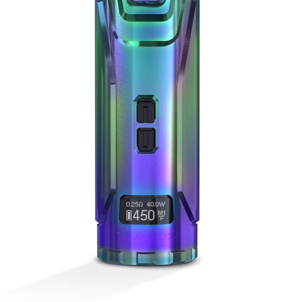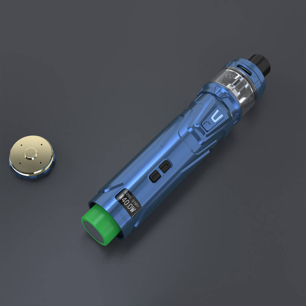 Der ULTEX T80 Akkuträger verfügt über eine maximale Ausgangsleistung von 80 Watt. Gedampft wird dabei in den Modis POWER / BYPASS / TEMP (NI/TI/SS) / TCR. Für die Inbetriebnahme wird eine separat erhältliche 18650er Batterie benötigt, die am unteren Ende in das Akkufach eingestzt wird. Mit 2A QC kann der Akku via USB zügig geladen werden. Über ein 0.49 Zoll OLED Display bekommt man alle relevanten Werte übersichtlich angezeigt. Über dem Bildschirm sind mittig zwei Bedien-Taster positioniert worden, die mühelos durch das Menü steuern.