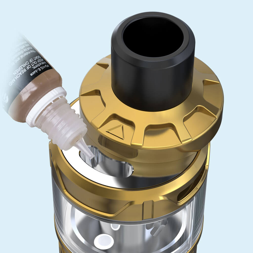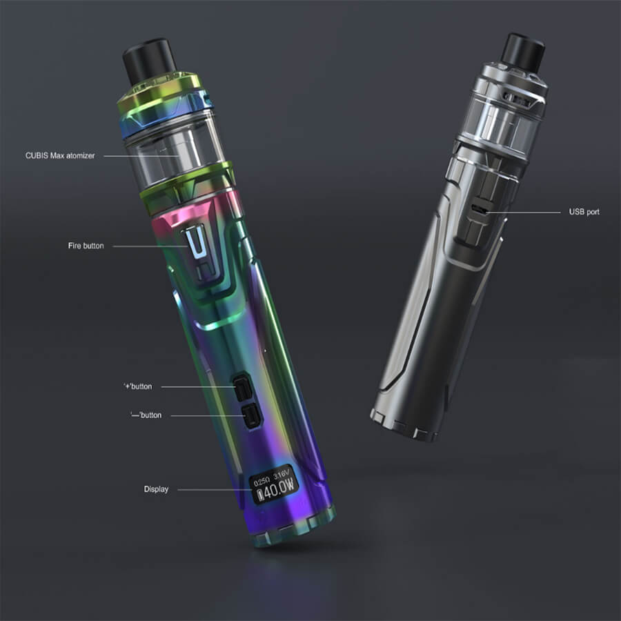 Perfekt in Szene gesetzt wird der Mod in Verbindung mit dem neuen CUBIS Max Verdampfer, der ein sattes Füllvolumen von 5ml vorweisen kann. Befüllt wird dieser mit der komfortablen Push-to-open TopFill-Methode. Dieser Verdampfer beinhaltet zusätzlich eine revolutionäre Neuerung und wird, statt mit Coils im herkömmlichen Sinn, mit den Joyetech NCFilm (Heizelement) verwendet. Diese Heizwendel sitzt horizontal im Verdampfer und hat eine größere Oberfläche, wodurch sich die Hitze gut verteilt und das Liquid besser verdampft wird. Dadurch wird die Entstehung von Geschmack und Dampf optimiert. Eine TopAirflow unterstützt diesen Prozess und kann nach Wunsch stufenlos geregelt werden. Die oben liegende Position der AFC macht den CUBIS Max obendrein noch etwas auslaufsicherer. Das Austauschen der Watte gestaltet sich problemlos. Desweiteren ermöglicht diese Coilless-Konstruktion eine deutlich einfachere Reinigung.