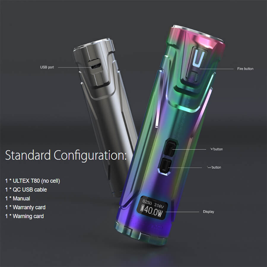 Joyetech präsentiert den neuen innovativen ULTEX T80 Mod, mit zylindrischem Gehäuse im Metallic-Look, dessen Form anschmiegsam in der Hand liegt. Er ist 95mm hoch, hat einen Durchmesser von 26mm und wird in unterschiedlichen Farben zum Kauf angeboten.