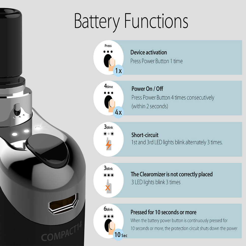 Justfogs Compact 14 wird von einem verbautem 1500mAh betrieben. Drei kleine LED-Lämpchen befinden sich neben dem Feuer- bzw. An/Aus-Knopf und informieren über den aktuellen Batterieladestand und eventueller Fehlfunktionen. Über den Micro-USB-Anschluss wird die Akku-Zelle wieder effektiv geladen. Mit dem integrierten Chip kann im Spannungs-Modus gedampft werden. Das Kit verfügt über einen eGo / 510er Anschluss.