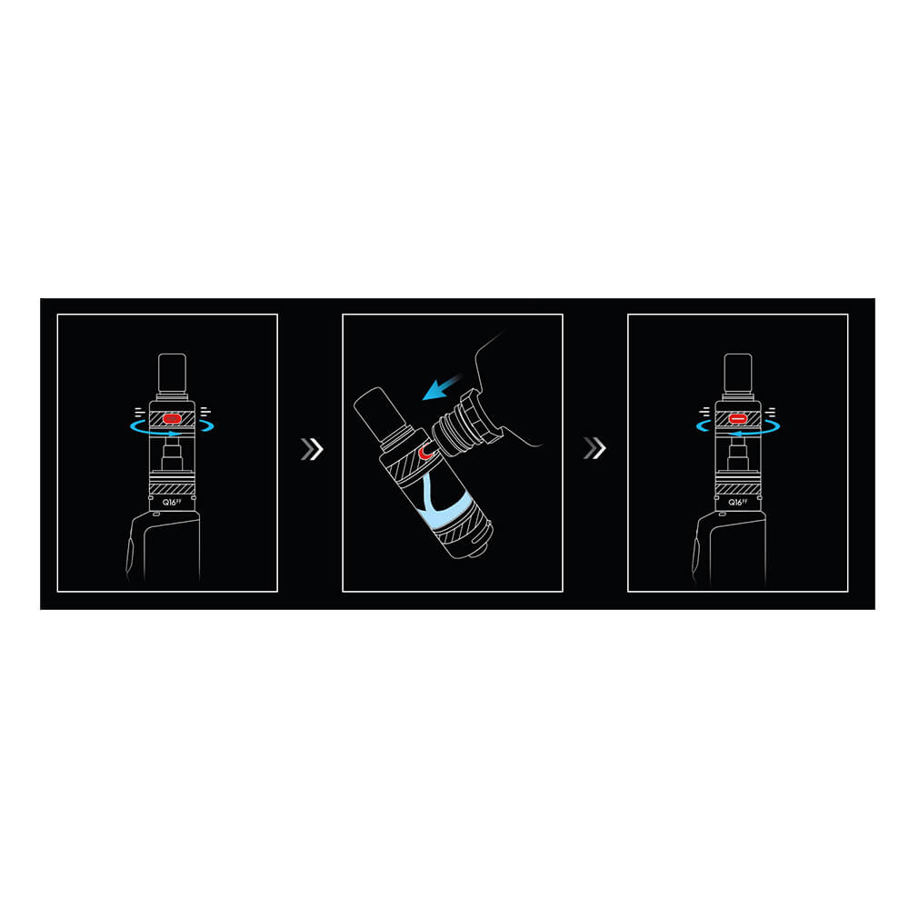 Über den Standard 510er Anschluss werden Mod und Verdampfer miteinander verbunden. Der Q16 FF Tank hat ein 1.9mm auslaufsicheres Füllvolumen, welches durch das praktische Topfilling (Drehung der Cap) mit Liquid aufgefüllt wird.