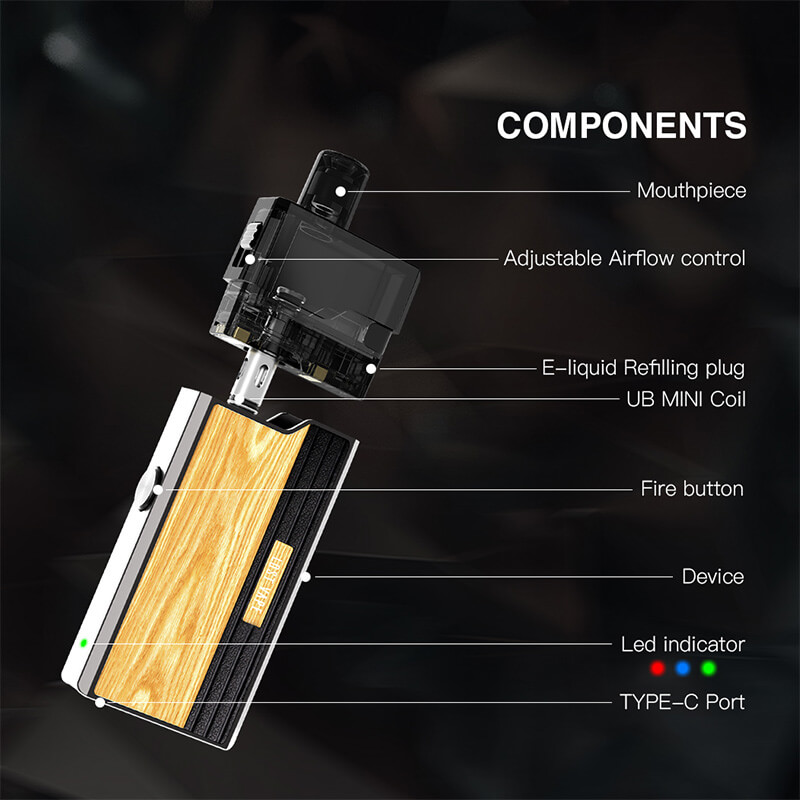 Der dazugehörige Pod wird magnetisch befestigt und bringt ein 3ml Tankvolumen mit, welches komfortabel via Sidefill mit Liquid befüllt werden kann. Über einen Schieber an der Cartridge lässt sich der Luftzug der Airflow regeln. Es passen die Verdampferköpfe der UB Mini Mesh Coil Serie (S1 0.8 Ohm / S2 1.0 Ohm) in den Pod, welche hauptsächlich für das Backendampfen ausgelegt sind. Der Coilwechsel ist Dank Push & Pull zügig erledigt.