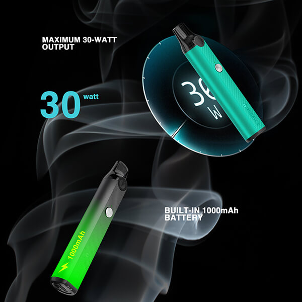 Eine integrierte 1000mAh Akkuzelle feuert das Gerät an, so dass bei einer Leistungsausgabe zwischen 7 Watt und 30 Watt gedampft werden kann. Durch das kleine LED Lämpchen erfährt man den derzeitigen Ladestand, so dass man stets darüber Bescheid weiß, wann ein neuer Ladezyklus erforderlich ist. Geladen wird via USB-C.