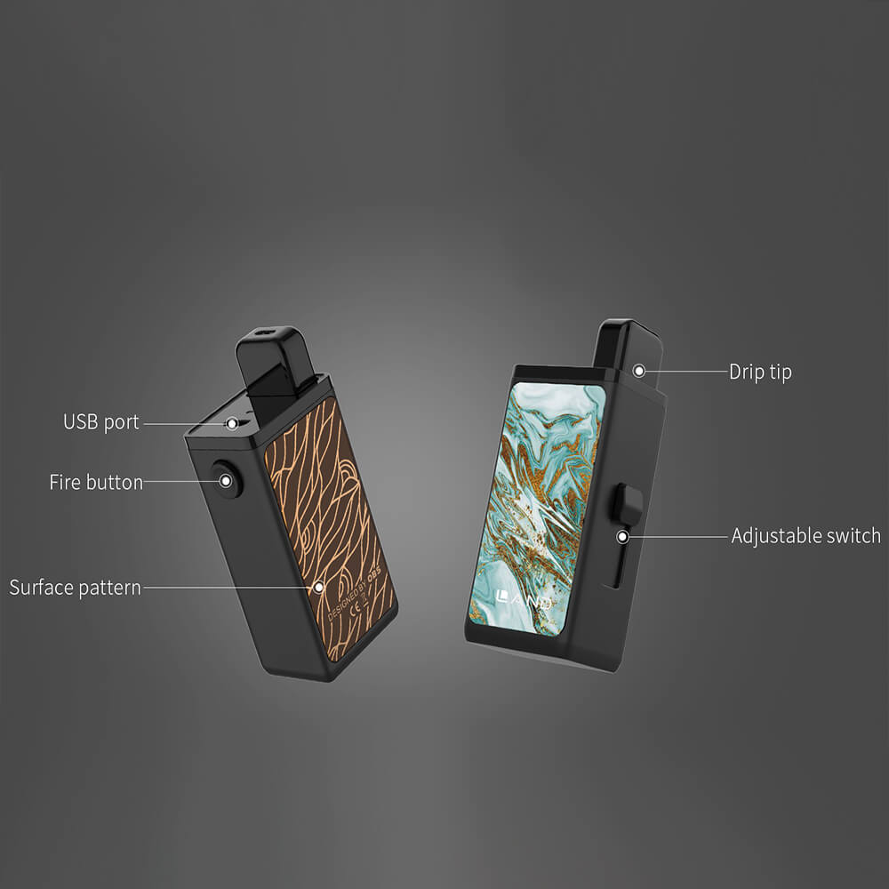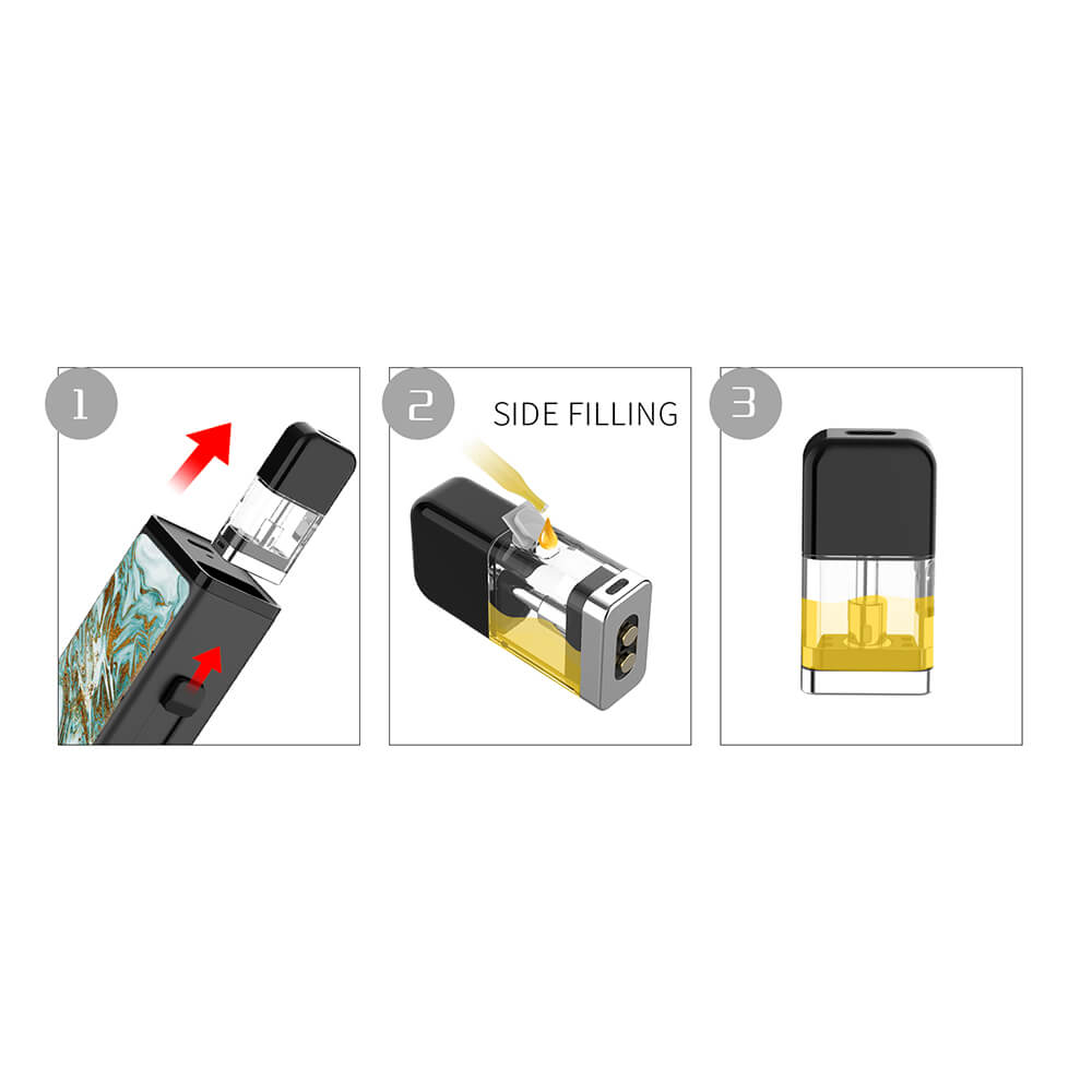 Durch eine simple Plug´n Play-Funktion wird die Cartridge mit dem Mod verbunden und liefert ein 1.5ml Füllvolumen, welches seitlich mit Liquid betankt werden kann. Der Pod ist einziehbar und kann am seitlichen Schieber ein-bzw. ausgefahren werden.