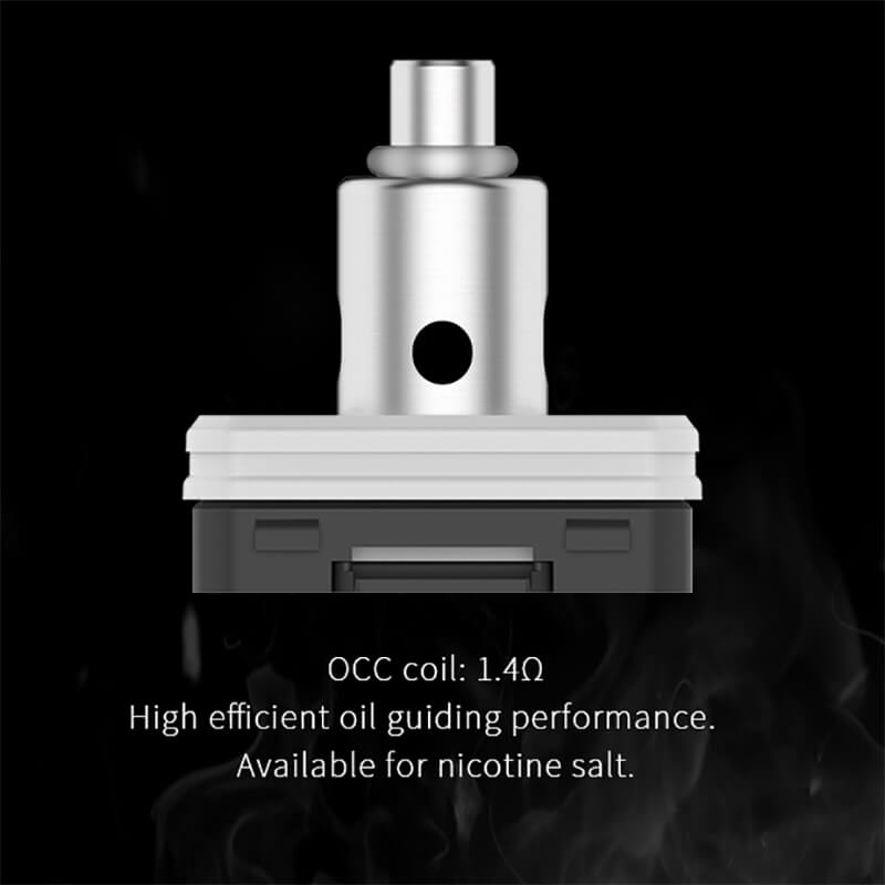 Die Cartridge verfügt zum einen über ein 1.5ml Tankvolumen, welches von unten mit Liquid befüllt wird und zum anderen über einen integrierten OCC Verdampferkopf, mit einem Widerstand von 1.4 Ohm, für ein aromatisches Backendampfen (MTL).