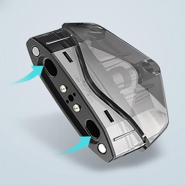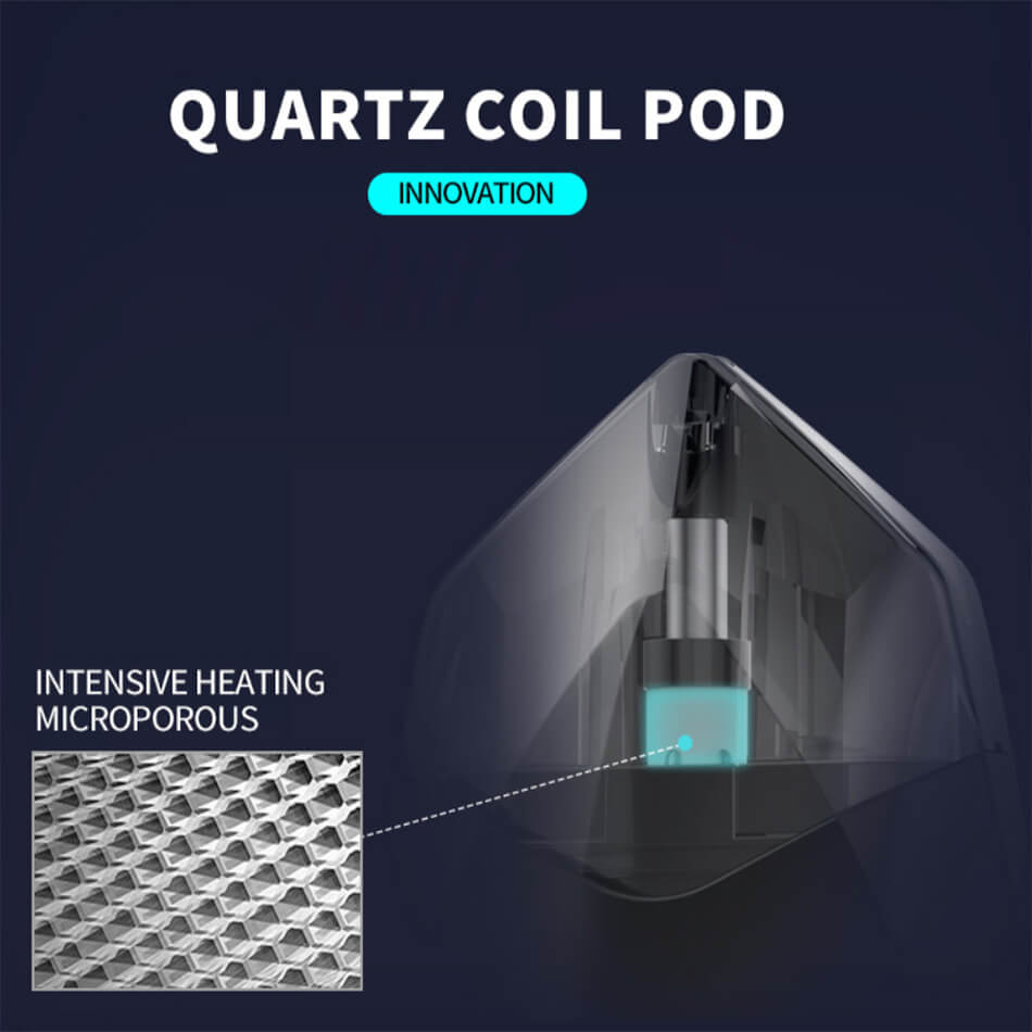 Die Cartridge (Pod) sitzt auf den Mod und wird durch einfaches Plug´n play magnetisch auf den Karat montiert und gehalten. Die Tankpatrone verfügt zum einen über ein 2ml Füllvolumen, welches von unten, nach dem Öffnen der Gummistöpsel vollgefüllt wird und zum anderen über einen integrierten Verdampferkopf, mit einem Widerstand von 1.3 Ohm. Dieser Coil ist optimal für das Backendampfen (MTL) geeignet, denn dessen Zug kommt dem einer echten Zigarette recht nahe. Außerdem besteht der Kopf aus hochwertigem Quarz, wodurch seine Lebensdauer deutlich verlängert wird.